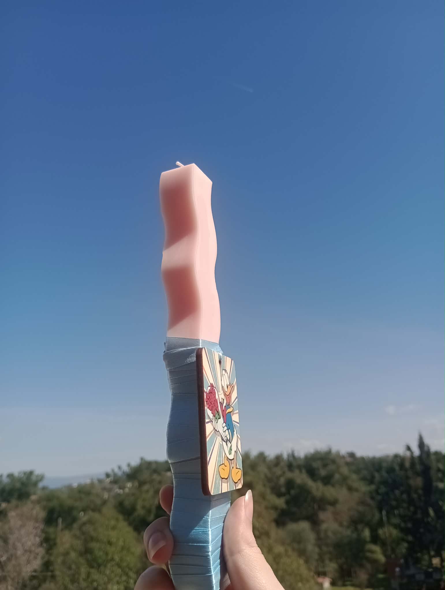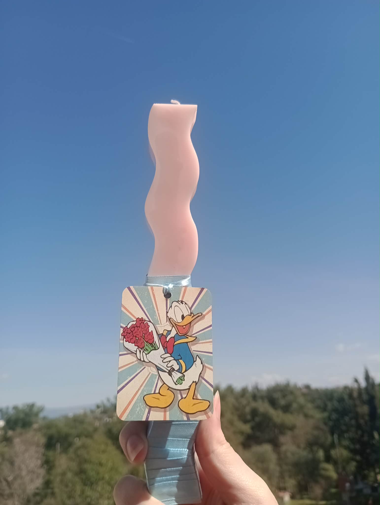 Το διακοσμητικό στοιχείο της λαμπάδας είναι ένα όμορφο ξύλινο σχέδιο με τον αγαπημένο -μικρων κ μεγάλων- χαρακτήρα της Disney, τον Donald Duck, ο οποίος κρατά ένα μπουκέτο λουλούδια. Η χαρούμενη εικόνα του προσθέτει μια παιχνιδιάρικη πινελιά και κάνει τη λαμπάδα ιδιαίτερα ελκυστική για παιδιά, αλλά και για όσους αγαπούν τους κλασικούς ήρωες της Disney.