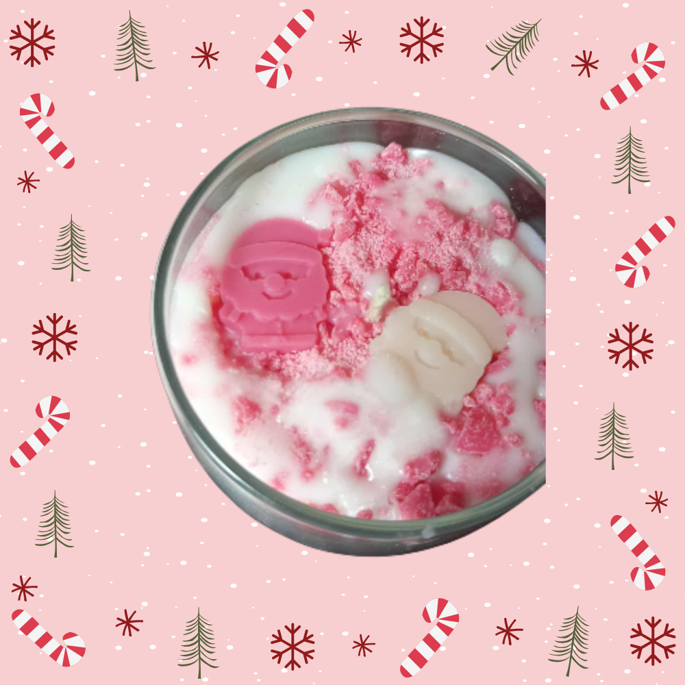 Στο εσωτερικό του θα βρεις χρωματιστές νιφάδες κεριού σε αποχρώσεις του ροζ και του λευκού, μαζί με χαριτωμένα χριστουγεννιάτικα διακοσμητικά από κερί σε σχήμα χαμογελαστών γιορτινών φιγούρων Αγίου Βασίλη, που προσθέτουν μια παιχνιδιάρικη, ζεστή πινελιά. Το συνολικό αισθητικό αποτέλεσμα είναι λαμπερό και γιορτινό, ιδανικό για να δημιουργήσει ατμόσφαιρα θαλπωρής και γλυκιάς νοσταλγίας.