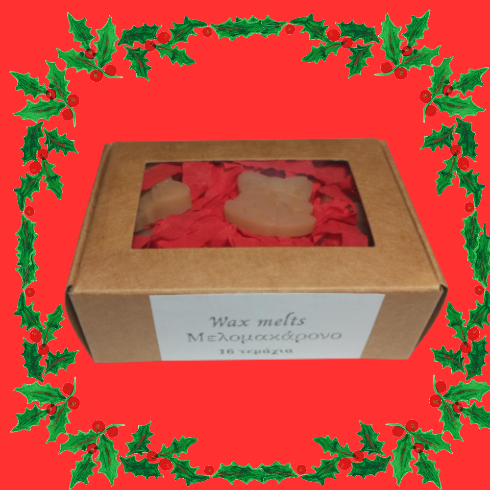 Κάθε wax melt είναι εμπλουτισμένο με το χαρακτηριστικό άρωμα του παραδοσιακού μελομακάρονου: ζεστό μέλι, γλυκό πορτοκάλι, μπαχαρικά και νότες καρυδιού. Πρόκειται για ένα άρωμα που αποπνέει θαλπωρή, Χριστούγεννα και γιορτινές αναμνήσεις, μεταμορφώνοντας κάθε χώρο σε μια μικρή, αρωματική γωνιά από ελληνικό σπίτι τις ημέρες των εορτών.